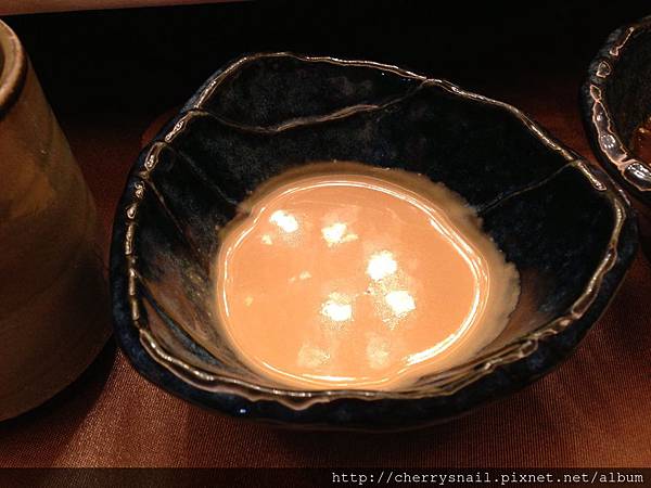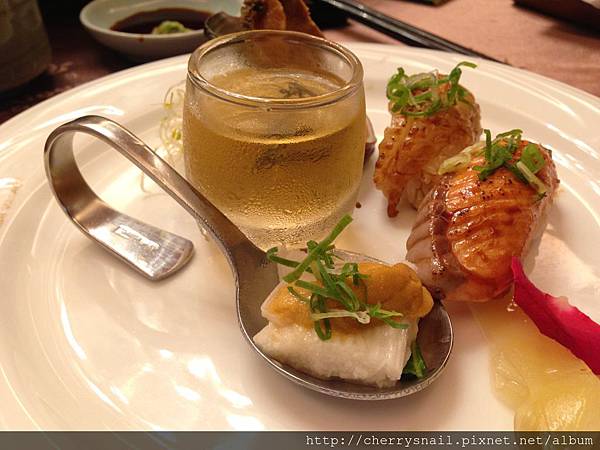 要先從湯匙的山藥海膽先吃,山藥滑潤海膽鮮甜,一口滑入嘴裡,兩者