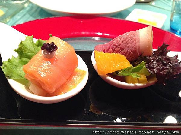 (左)魚子醬鮭魚 (右)香橙燻鴨