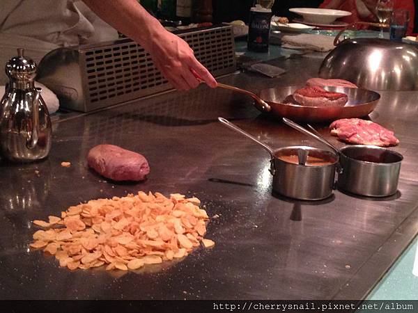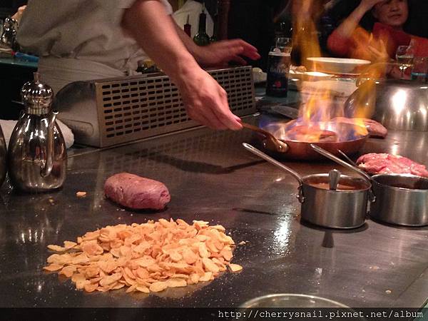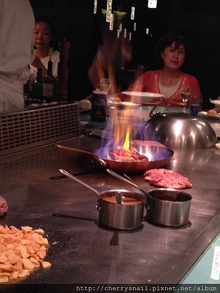 廚師正在表演白蘭地鴨胸,鴨胸可是他們的招牌ㄛ!