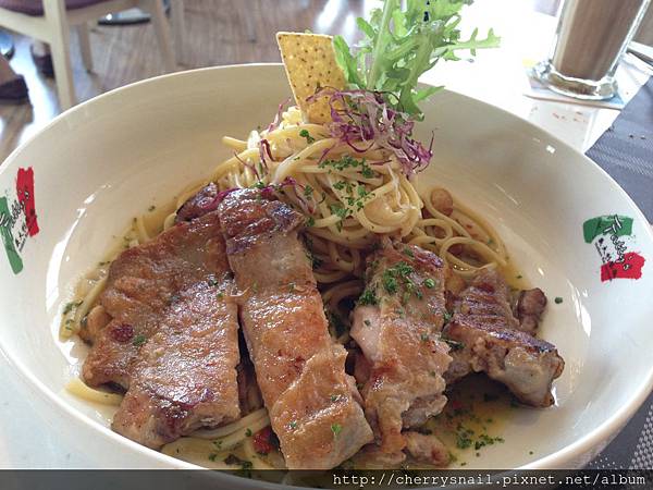 清炒辣味蒜香脆皮雞腿排義大利麵