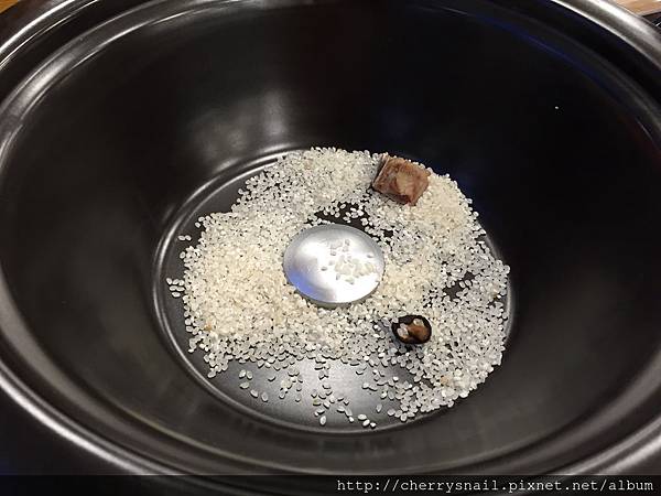 蒸煮之前服務人員會放入生米、排骨和香菇,然後利用蒸煮的食材所散